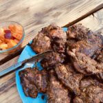 Fill peppers with meat-rice mixture. Roast in BGE on rack above coals (or put in 9″x12″ glass baking dish and bake) uncovered for 30 minutes.
